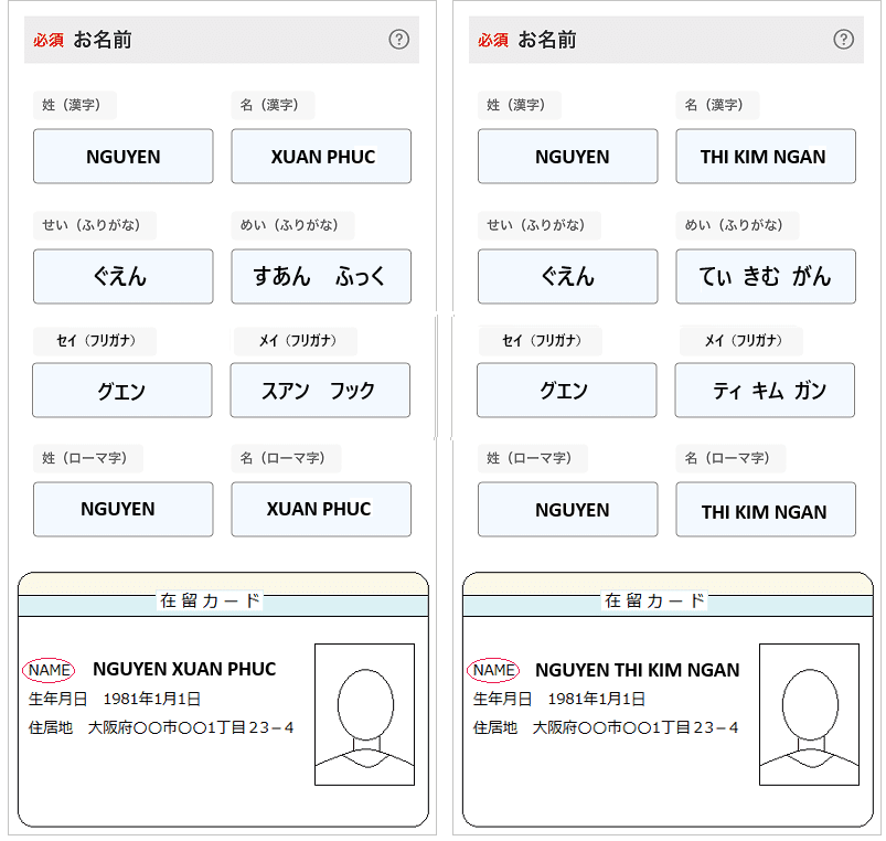 Tại đây bạn nhập họ tên. Hãynhập sao cho khớp hoàn toàn với tên ghi trên giấy tờ xác minh danh tính nộp kèm (thẻ cư trú, thẻ chứng nhận thường trú đặc biệt, v.v.). Dù có nhiều kiểu ghi như Kanji, Katakana, chữ La-tinh… cũng hãygiữ đúng đúng theo cách ghi trên giấy tờ xác minh danh tính.